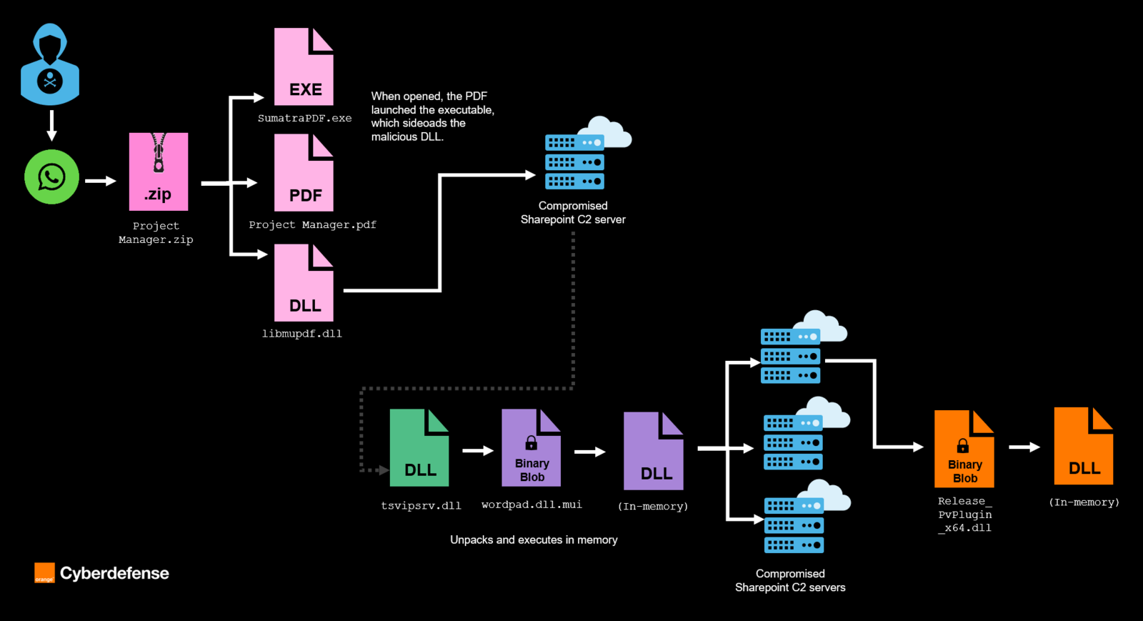 As a relevant hunting approach, you can for instance search for legitimate executables like SumatraPDF or TightVNC being created and executed inside the user’s personal directory (ie. Downloads, %TEMP%, …). You can also hunt for unexpected DLL loaded from non-standard directories.
