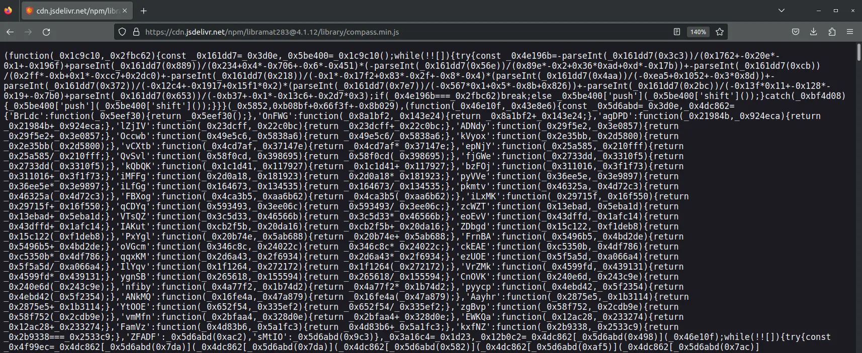 </script>The Node Package Manager (npm) is a widely used package manager for the JavaScript programming language. Requesting the JavaScript file returned highly obfuscated code as displayed in Figure 1.