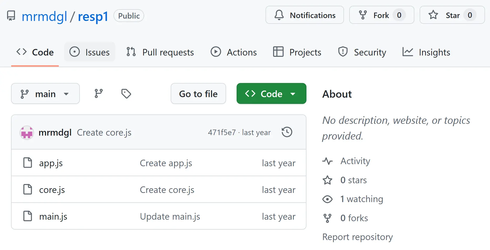As illustrated in the timeline, the adversary utilized GitHub repositories before transitioning to npm packages. These were all created by the user “mrmdgl” which itself was created on July 8, 2024. Investigating this account revealed more insights into the evolution of this phishing campaign. It started with the first repository, named “resp1”, to which the three files “main.js”, “core.js” and “app.js” were added.
