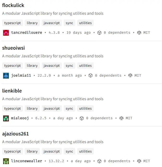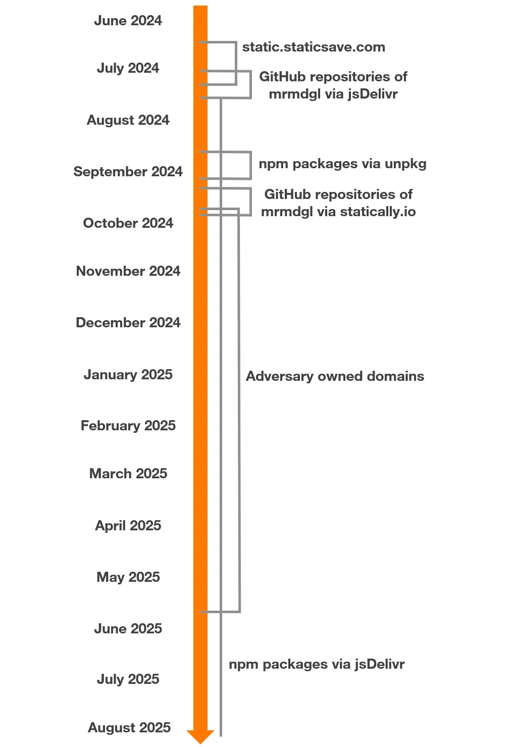 As the timeline shows, the adversary has mostly focused on using files in npm packages hosted on jsDelivr to deliver their malicious JavaScript code to the victims. We have found ~60 npm packages associated with this campaign.