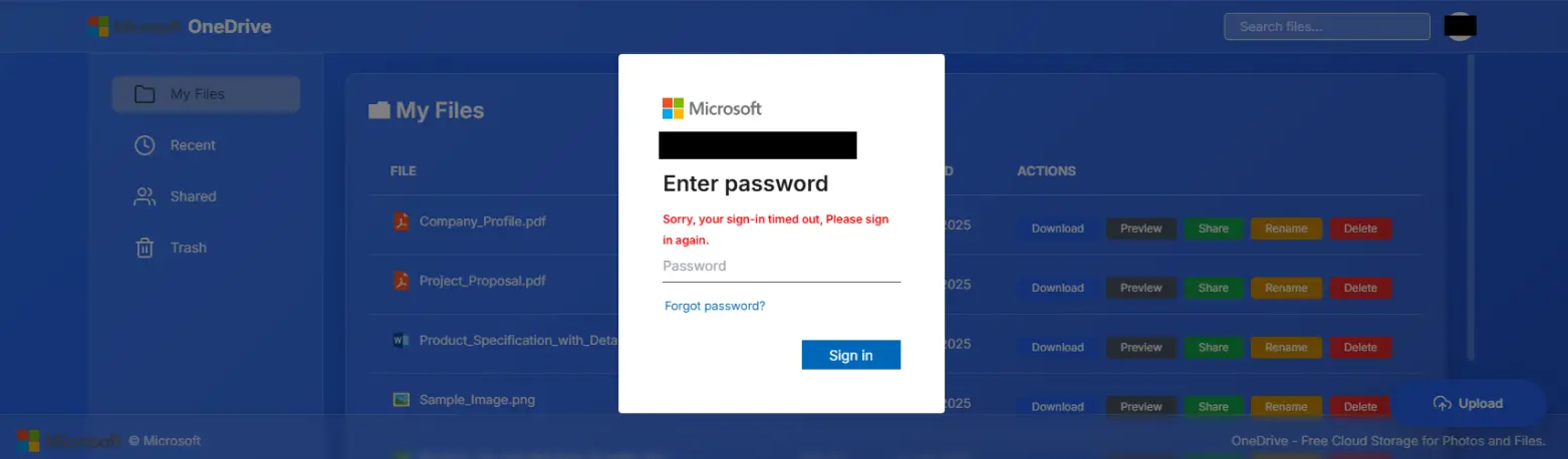 The deobfuscated code revealed a config which contained the values for the destination to which the user should be directed. The target URL was made up of a base URL, which in this incident was hxxps://fastflow[.]online/wlc/, as well as an additional identifier. The following request to this URL then returned a fake OneDrive page which acted as redirector. Clicking one of the links on that page resulted in an M365 phishing page being retrieved from the domain calmiquello1778[.]com.