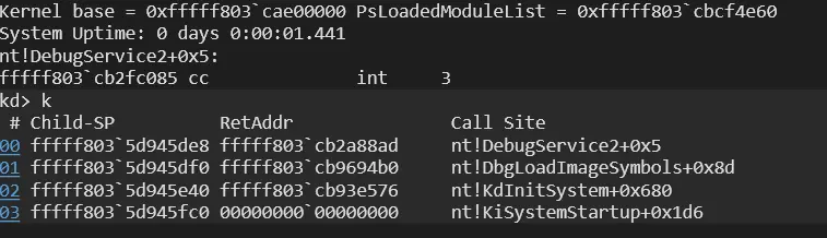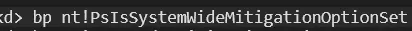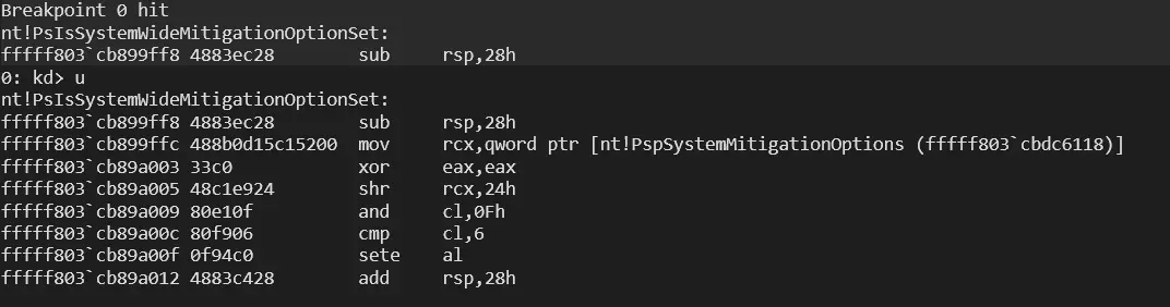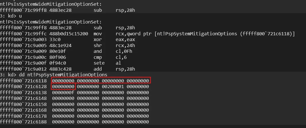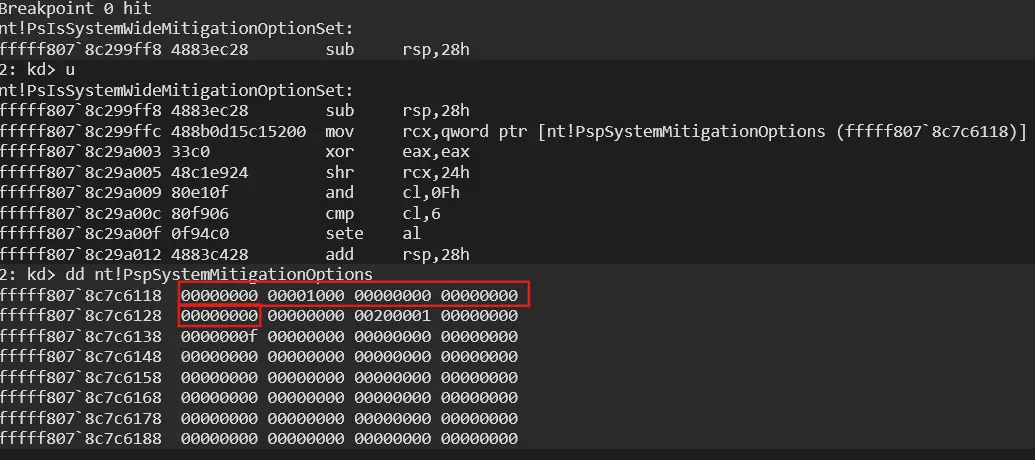 In order to verify that MitigationOptions are initialized during Phase 0, a virtual Windows 11 machine was examined using KDNET remote kernel debugging. A breakpoint was established within a kernel routine that directly accesses the global mitigation table: PsIsSystemWideMitigationOptionSet.
