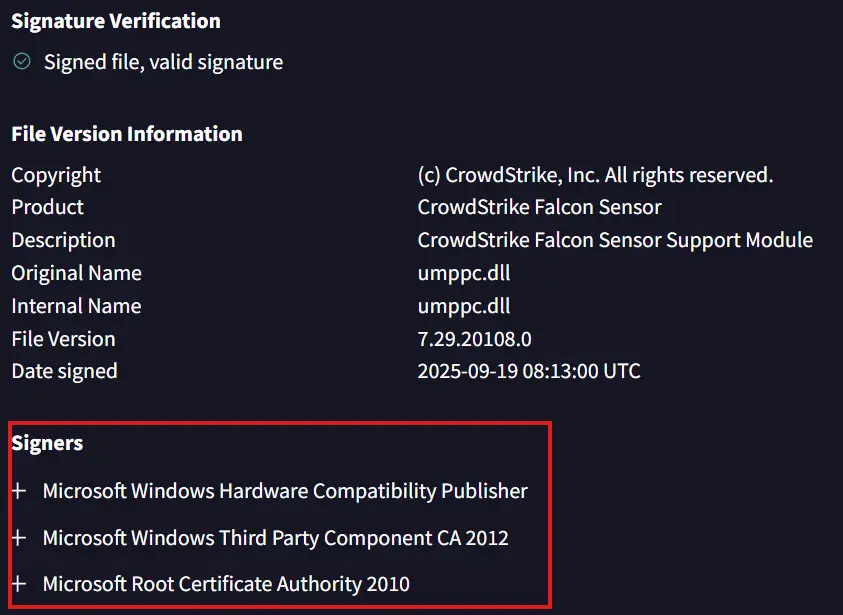 Some EDR vendors, such as CrowdStrike in this example, have modules that are officially signed by Microsoft, such as “Microsoft Windows Hardware Compatibility Publisher” or “Microsoft Third Party Component CA”. These modules can still be loaded even when MicrosoftSignedOnly is enabled globally. Such EDRs can continue to provide some of their functionality. Conversely, products without Microsoft signatures lose a large proportion of their monitoring capabilities.