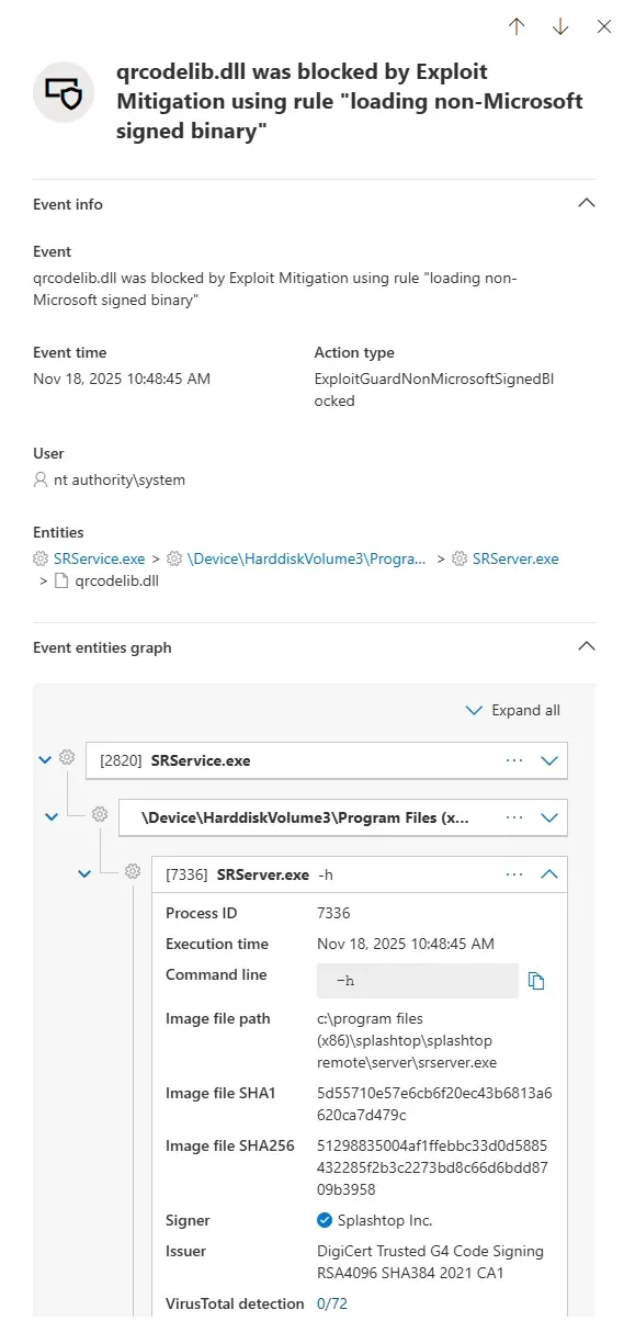 The illustration shows how the MicrosoftSignedOnly countermeasure prevented SRServer.exe from loading the signed DLL, qrcodelib.dll.