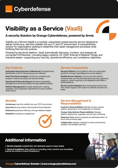 Visibility as a Service (VaaS) is a modular, subscription-based security service designed to deliver continuous, real-time visibility into your IT and OT environment. A comprehensive solution for organizations seeking to streamline their asset management processes while fortifying their security posture.