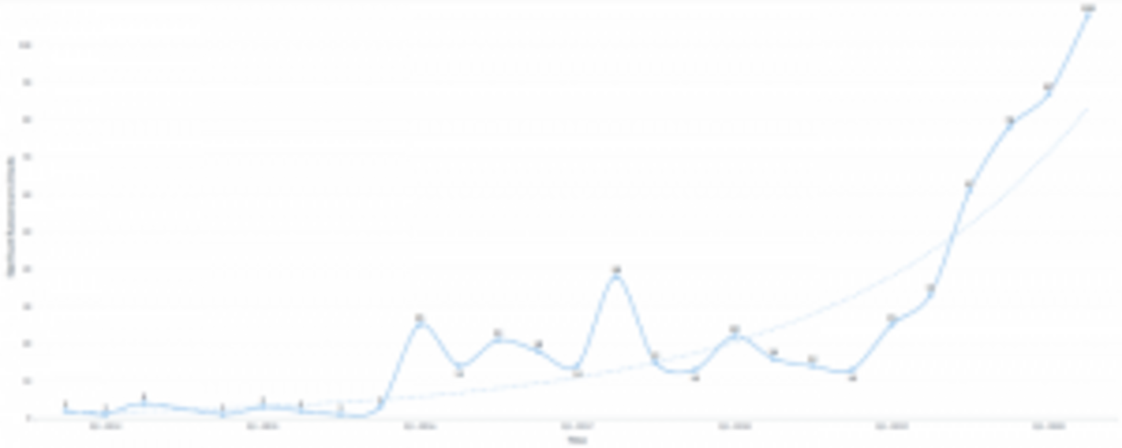 Vid den tiden verkade det tydligt att ransomware, som en form av brott, sannolikt inte skulle få något fäste eftersom det var alldeles för svårt att få betalning från offret. Numera verkar det slutliga citatet smått ironiskt. Trenden var, som det visar sig, allt annat än ”tillfällig”, något som diagrammet nedan illustrerar.
